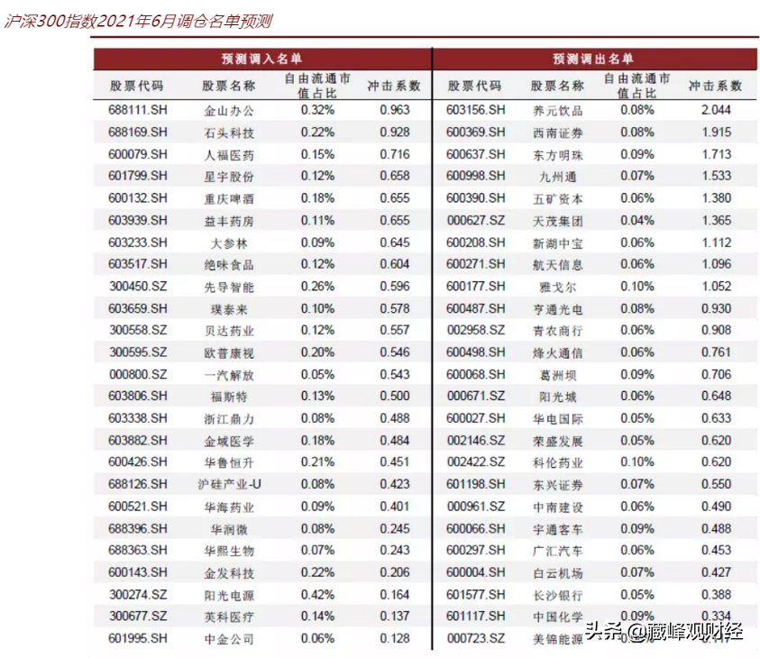 滬深300指數2021年6月中金公司預測的調倉名單: