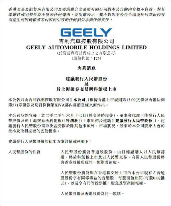 6月17日深夜,吉利汽車披露公告稱,公司董事會批準可能發行人民幣股份及于上海交易所科創板上市的初步建議。一旦建議得到落實,吉利汽車將成為首個在科創板上市的整車概念股。