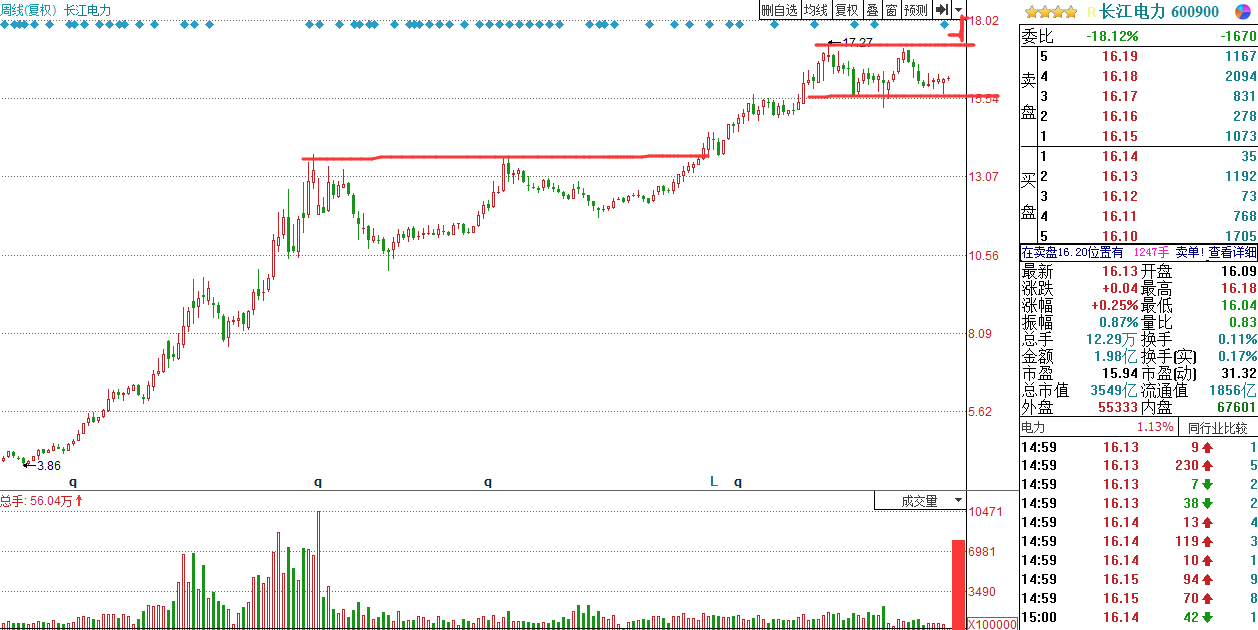 以長江電力為例,這只股票是明顯的上升趨勢,在大市環境弱勢的情況下,能維持在高位震蕩整理說明這只股票的勢頭非常猛,未來就是關注這些股票的機會。等待放量突破之后干進去設置一個止損就可以了。