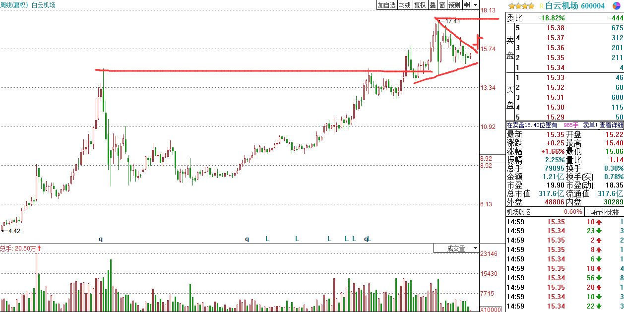 以白云機場為例,這只股票突破了前期高點之后都會重新去做形態,關鍵是這個收斂形態突破之后進場的問題,斜邊突破就進場,但是在前期高點附近了結一次,再創新高再進場。靈活應變,如果大市夠好,可以耐心持有。