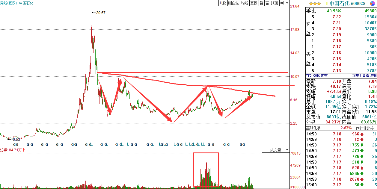 以中國石化為例,按照形態找出頸線,頸線突破之后注意前面的成交密集區,按照沽壓去尋找進場的時機,千萬不可以提前潛伏,根據以往這種股票的經驗,突破一般都是非常凌厲的,需要集中精力去等待。