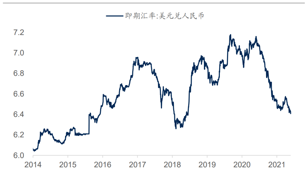 反觀國內,從2020年疫情爆發到現在中國的貨幣政策一直相對平穩的狀態,同時在全球范圍內疫情率先得到有效控制,工業持續高景氣,從而導致了人民幣持續升值。