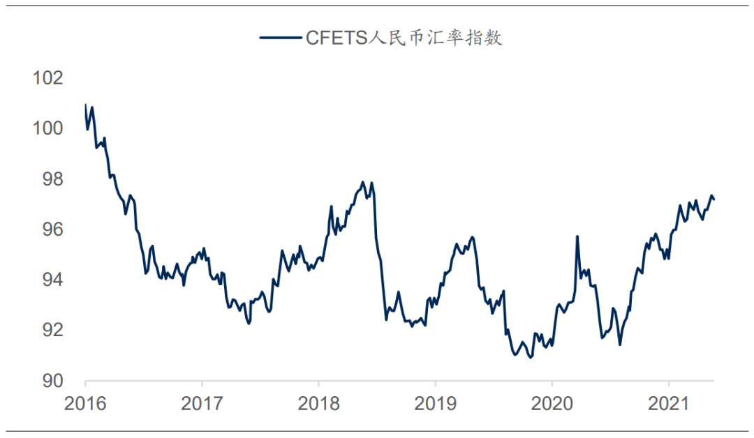 同時人民幣兌一攬子貨幣也同樣走出了明顯的升值趨勢,中國外匯交易中心的CFETS人民幣匯率指數從2020年下半年的低點91.4上升到目前的約97.2,升值幅度達 6.3%。