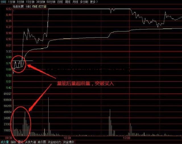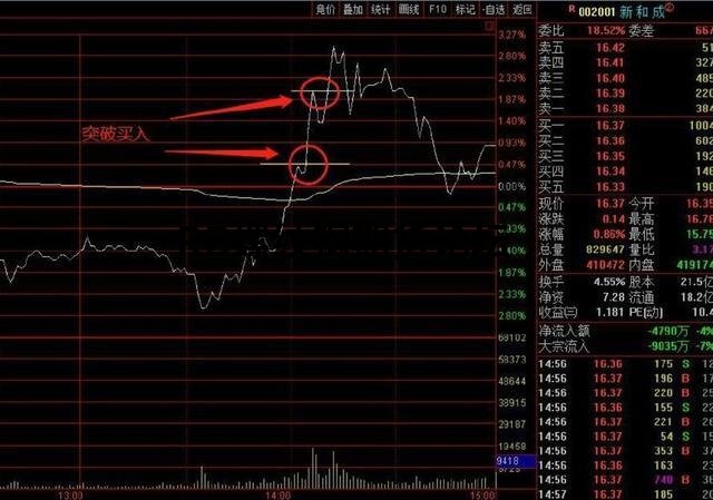 在早盤9:30后有一波反彈,至9:32時反彈結束開始回調,回調到9:35剛好是均價線處受到支撐,此時回調的幅度在上波反彈幅度的二分之一左右,屬于中度回調,很快該股又展開了反彈,說明主力做多的心情比較迫切,回調發短小也是不想給投資者在低位撿取籌碼的機會,由于能量未能超過上一波反彈的能量,第一次調整后的上漲未能突破上波反彈的高點,稍作調整之后該股再次發力上漲,配合成交量大幅放大超過了上一波反彈的成交量,該股輕松的突破了上波上漲的高點,此時正是我們短線積極介入的最佳買點,應該堅決買入,千萬不要錯失良機。