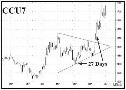 一般來說最終的突破是與早在28天前的階段性頂部/底部的形成同一方向,但也有例外的時候,如下圖的可可豆走勢所示,早在28天前形成階段性底部,但最終突破方向相反。