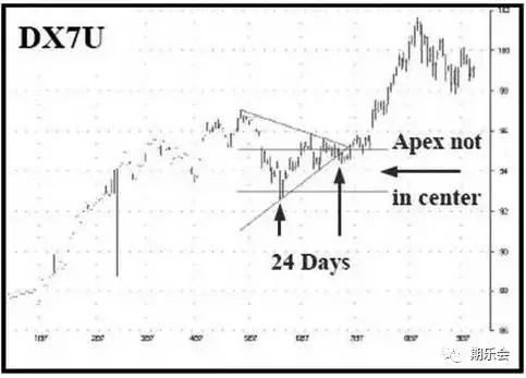 下圖9月美元三角形態中有兩個明顯的警告標志,因而我沒有在初期下方突破時進行交易。首先,請注意,正如先前討論的,三角形頂點沒有出現在原圖形的1/3中心區域,反而是發生在1/3上方區域。其次,下跌突破發生在第24日,這也是假突破的一個跡象。兩點警告的結合可以很好地防止錯誤的交易,將下單時間放在第25天至第27天上午之間,你會大大受益,并消除了很多虛假突破。
