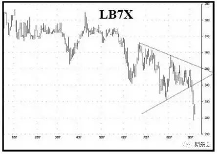 當9月木材期貨在第24天發生假突破,我分析了更遠的幾個月,注意到11月合約也已形成了一個對稱三角形,但沒有執行假突破。我將此視為一個信號,交易11月合約而不是9月合約,以取得好的結果。正如所料,9月合約返回到三角形內,且在第26天發生了下跌。如果你已進行了9月合約的交易,那在第4天上午,你不得不根據盈虧平衡點平倉出局。我交易了11月合約,因為它沒有出現虛假突破。選擇哪個合約進行交易,我將其稱為交易的“藝術”,且這不容易程序化。經驗在這樣的交易選擇中發揮了很重要的作用。