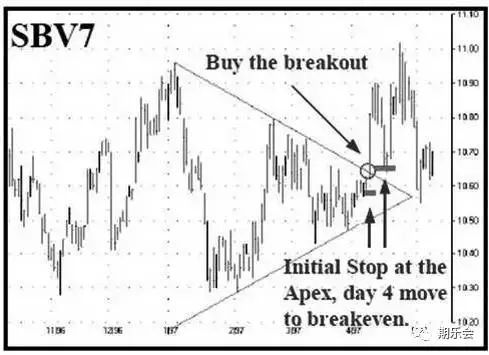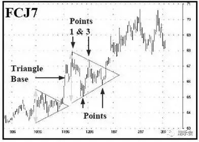 如果頂點發生在上1/3部分,這可能是一個警告,因為市場在完成走勢之前可能還有一個下移的動作。同樣,如果頂點出現在下1/3部分,這可能是一個警告,因為市場完成走勢之前還有一個上移的動作。如果你決定在危險地區交易三角形形態,并認為這是一個對稱三角形,那么你可以考慮使用買入跨式期權straddle,而不是直接進行期貨合約的交易,以減少雙邊虧損出現的可能性。