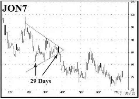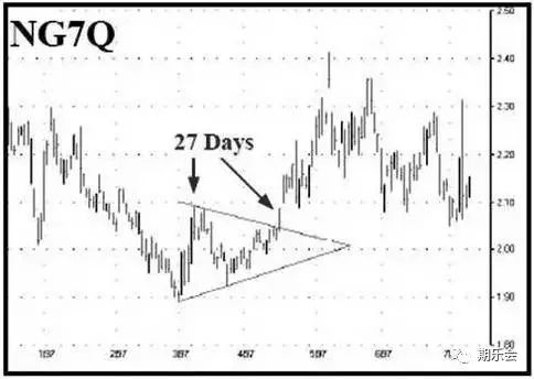 交易者用對稱三角形進行交易,聽到最多的抱怨是假突破和接踵而至的雙邊虧損。根據我的經驗,假突破通常發生在“計數日”開始的第23或24天,而且這個提前到來的突破經常以返回三角形內部并最終向其他方向突破而告終。由前所述,我們知道了在28天周期突破的形式后,市場可能的走向。將在此之前可能發生的假突破與之結合,我們建立了一個自第25天至第27天上午的機會時間窗。通過等待這個時間窗,我們可以消除很多其他交易者可能陷入的假突破。
