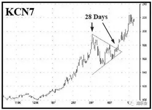 我發現三角形突破往往發生在一個階段性高點/低點起的28天內,如咖啡期貨日線圖(下圖)所示。
