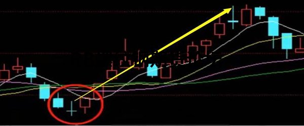 如果中間的三根陰線,帶有很長的上影線,那么該形態的看漲信號也會更加的強烈。