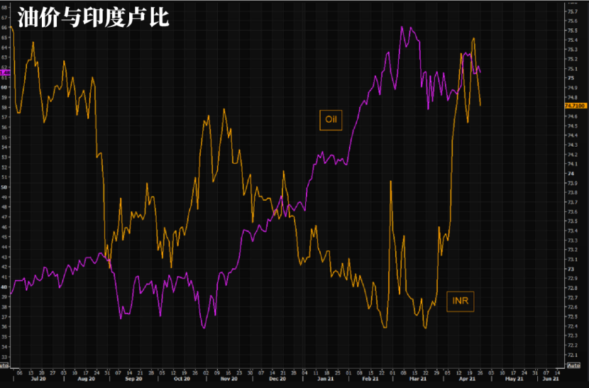 油價在3月早些時候達到峰值,但此后一路走低。也許這只是一個巧合,但自從印度確診病例數開始攀升,油價就停止上漲了,盧比也明顯遭受到了巨大的打擊。