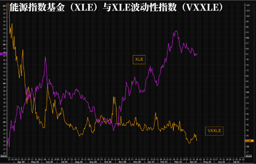 盡管XLE表現不佳,但XLE波動性指數()相較于低點卻有所升高,不過最近略有走低。如果印度疫情對石油需求造成負面沖擊,那么最終受益的可能就是OVX和指數。金融博客零對沖認為,在當前水平做多XLE波動率將會非常有趣。