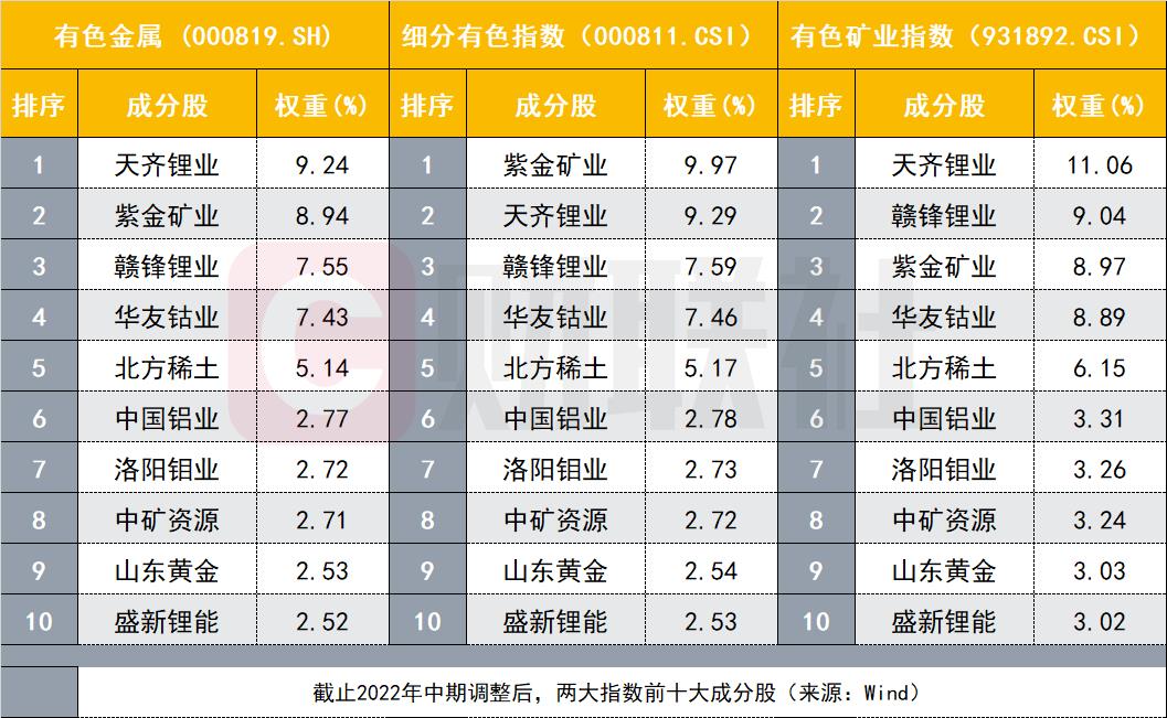 在2022年中期調整之后,建信有色ETF、南方有色金屬ETF、以及即將發行的國泰礦業ETF各自跟蹤的中證細分有色金屬產業主題指數(.CSI)、中證申萬有色金屬指數()和中證有色金屬礦業主題指數(.CSI),無論是前十大成分股構成,還是權重排名幾乎都大同小異。