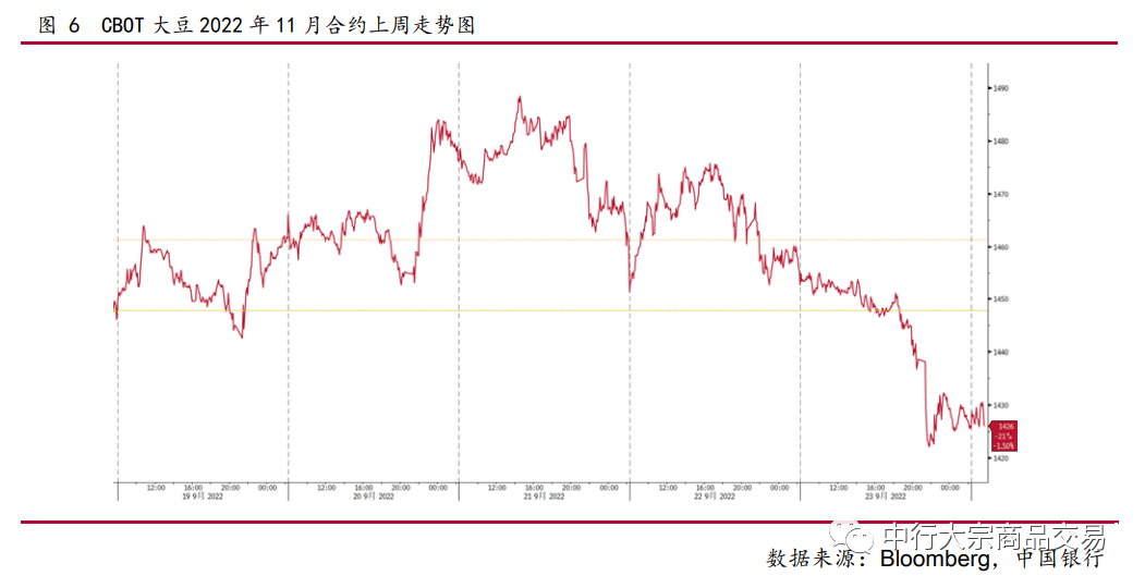 上周CBOT大豆合約震蕩下行,周初11月合約在消費預期推動下上行接近1490美分,但受制于美元走高,回吐大部分漲幅。周五下午,歐元區和英國制造業PMI數據公布不及預期,市場擔憂經濟衰退前景影響需求,加之美元指數再度大幅拉升,引得豆價深跌至1420美分一線。