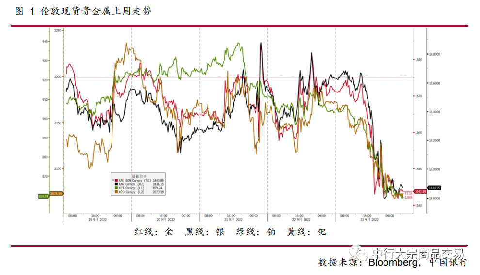 上周在美元指數和美債收益率大幅走強的背景下,各類資產普遍走低,貴金屬板塊也受到明顯壓制。黃金表現出相當韌性,全周下跌1.86%,其余品種跌幅均超過3%。