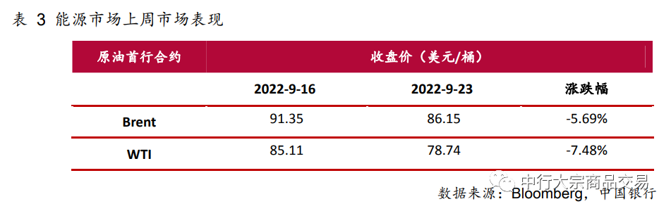 上周三,美聯儲加息靴子落地,加息75個基點符合市場預期。不過,美聯儲主席鮑威爾在新聞發布會暗示未來會進一步大幅加息,對經濟前景預測更弱,因此市場對未來美國經濟衰退的預期并未緩和。此外,在美聯儲大幅加息之際,美元指數也不斷走高,拖累油價。