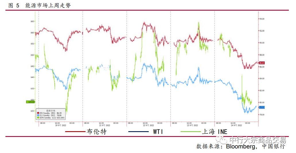能源市場方面,國際油價連續第四周下跌,WTI原油失守80美元關口,因對全球經濟放緩的擔憂蓋過俄烏局勢升級的影響。整體來看,目前油市情緒悲觀,強勢美元以及市場對經濟衰退的擔憂將繼續成為油價最大的利空因素。我們認為在宏觀形勢明朗前,油價交易重心將大概率進一步下移。本周關注OPEC+集團對油價下跌的應對,以及烏東四州公投結束后俄烏局勢的走向。