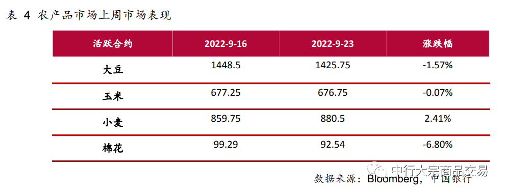 上周農產品市場沖高回落,漲跌不一。咖啡、小麥、白糖等品種得益于周初的漲幅,周線得以收漲,可可、棉花表現不佳,玉米則基本持平于前周水平。豆類各品種中,除了豆粕表現尚可,大豆和豆油均出現了顯著下跌。美元指數不斷刷新20年新高,歐洲經濟前景拖累需求預期,豆價后市預計仍將承壓。