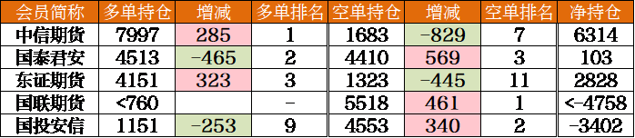 多、空排名前3的席位中,有3家持有凈多單,除國聯期貨外,今日加多減空、加空減多各有2家席位。