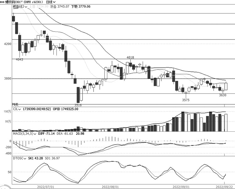 螺紋鋼主力合約2301于8月9日反彈至4018元/噸一線,受前期底部壓制,轉而回落走低,進行了一個二次探底的過程。主力合約于本月初探底至3575元/噸再度反彈,此時均線系統由瀑布式的下行轉為平緩傾斜式,在此過程中也完成了主力合約的轉換,近期的沖高回落再次形成階段性小雙底。