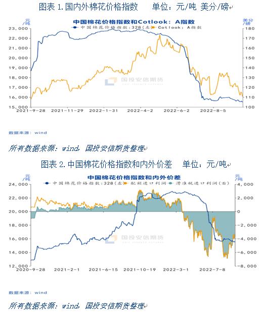 本周新疆越來越多的軋花廠開秤收購籽棉,機采棉40%的衣分主流報價在5.1元/公斤,部分相對高價在5.3—5.5元/公斤,棉籽的價格在3元/公斤左右,如果從目前的報價來計算新棉成本僅在11000元/噸左右。雖然近期鄭棉01合約連續大跌,但現貨基本持穩,現貨價格變化不大,9月27號2021/22新疆機采3128/28B/雜3.5%內主流一口價在15000-15300公定疆內庫,16000-16300內地庫,同品質點價稀少,大多在CF01+1500及以上疆內庫,CF01+2300-2600內地庫。2021年籽棉收購價格在9月份仍相對合理,在國慶假期期間一路瘋漲,這也導致今年棉價大幅下跌之后,軋花廠虧損急劇擴大,有了去年的教訓,今年軋花廠對于籽棉的收購普遍比較理智,雖然新棉成本大幅低于現貨和盤面,但預計軋花廠繼續控價收購的概率較大。