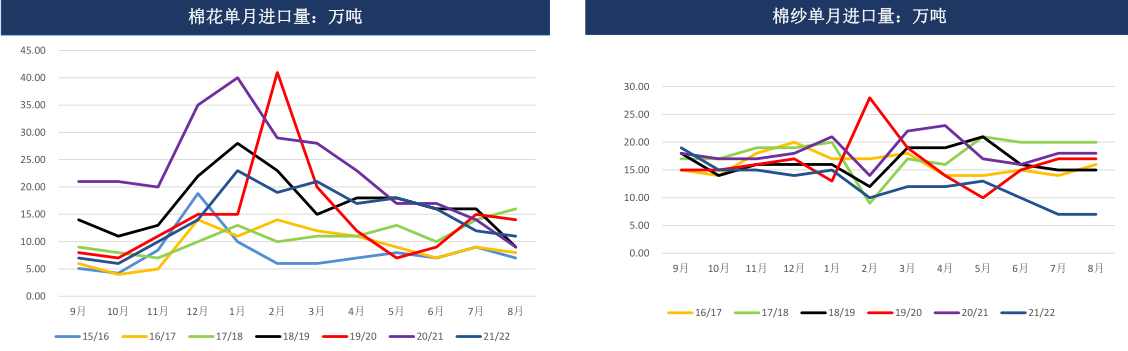 中國棉花進口:據統計數據,2022年8月我國進口棉花約11萬噸,環比減少約1萬噸,減少8.3%;同比增加2萬噸,增幅在24.9%。2022年1-8月我國進口棉花約137萬噸,同比下降約22.9%。2021/22年度(2021.10-2022.8)我國進口棉花約166萬噸,同比下降約52.4%。