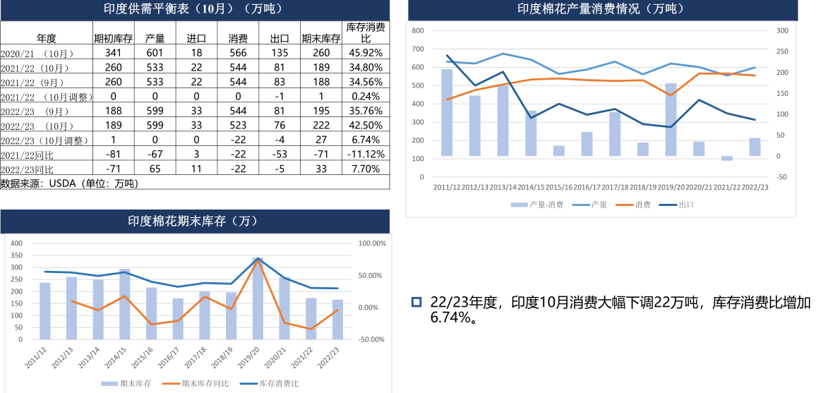 22/23年度,印度10月消費大幅下調22萬噸,庫存消費比增加6.74%。