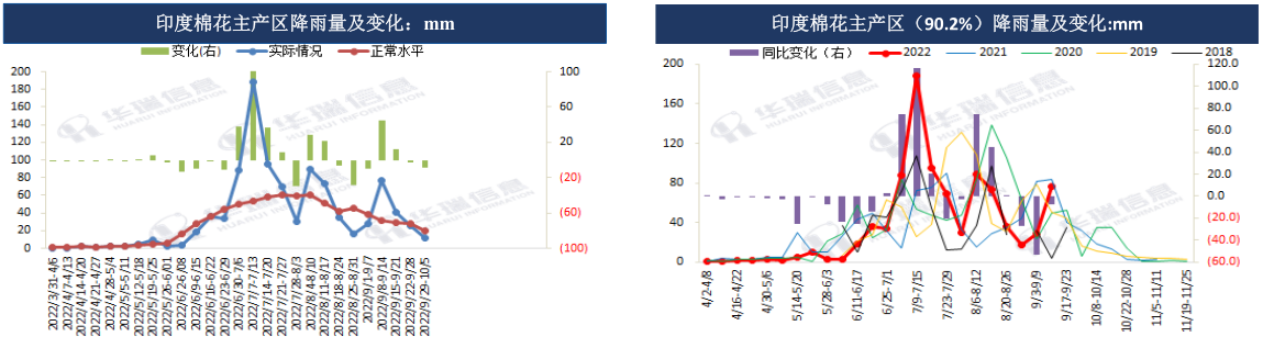 截至2022/9/29至2022/10/5當周,印度棉花主產區(92.4%)周度降雨量為11.8mm,相對正常水平低3.4mm,相比去年同期低20.2mm。2022/6/1至2022/9/28棉花主產區累計降雨量為952.1mm,相對正常水平高209.6mm。本周降雨量繼續減少,雨季基本結束。