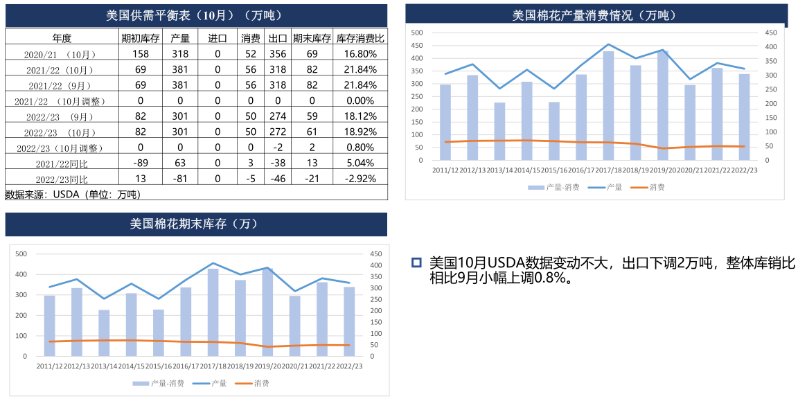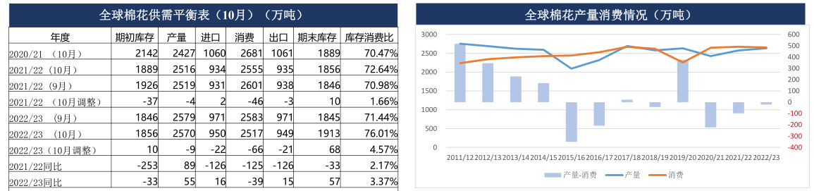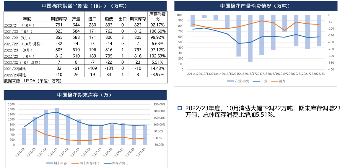 2022/23年度,10月消費大幅下調22萬噸,期末庫存調增23萬噸,總體庫存消費比增加5.51%。