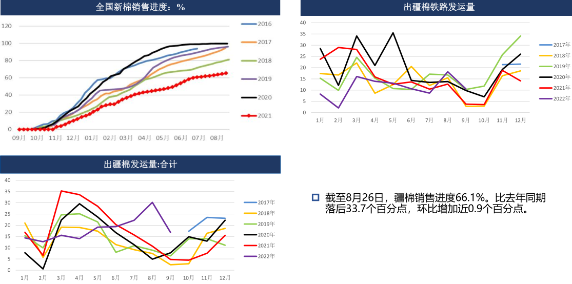截至8月26日,疆棉銷售進度66.1%。比去年同期落后33.7個百分點,環比增加近0.9個百分點。