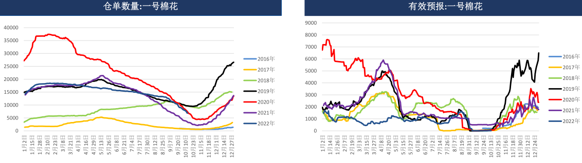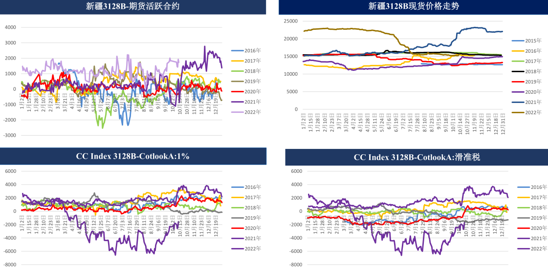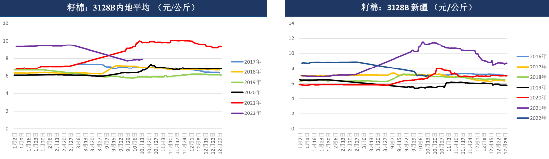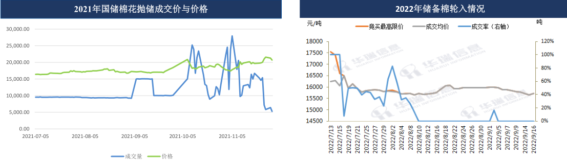 儲備棉輪入:2022年7月13日至10月14日儲備棉累計掛牌38.3萬噸,成交6.132萬噸,成交16.01%,成交加權均價15941元/噸。為保持數據連貫性,下圖中成交率為0時成交均價為競買最高限價。
