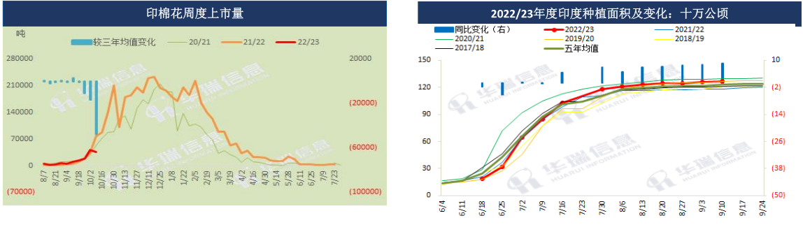 據AGM公布的數據統計顯示,22/23年度印度棉陸續上市。截至2022年10月9日當周,印度棉花周度上市量3.69萬噸,環比上一周減少0.5萬噸,較三年均值減少約4.77萬噸;印度2022/23年度的棉花累計上市量約14.28萬噸,較三年均值累計減少約7.47萬噸。