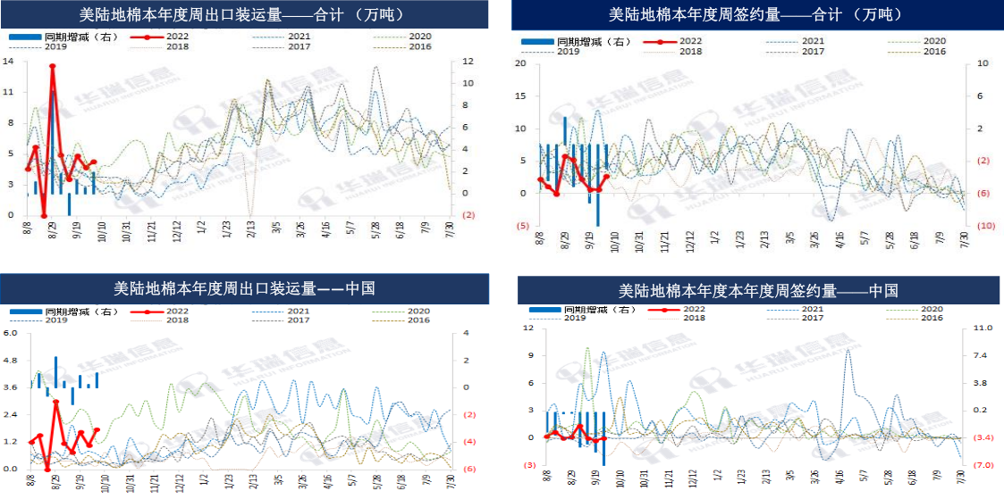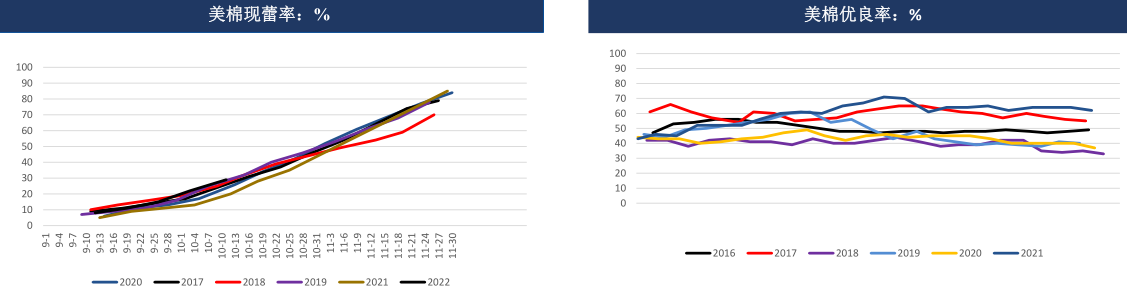 截止10月9號,美棉15個棉花主要種植州棉長優良率為30%,上周為31%,較上周下滑1個百分點;去年同期水平為64%,相差33個百分點,整體優良率依然較差。