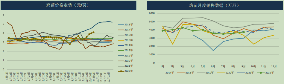雞苗價格走勢(元/羽)雞苗月度銷售數據(萬羽)?市場商品代雞苗價格以穩為主,均價為3.35元/羽,環比持平,主流報價3.20-3.50元/羽,個別高價3.70元/羽,個別低價3.00元/羽。雖然現階段蛋雞養殖利潤尚可,但飼料成本居高不下,養殖單位補欄心態趨于謹慎,多數選擇延長飼養周期代替補欄,雞苗市場供需繼續僵持。目前種雞企業訂單多數排至11月月底,個別排至12月中上旬,種蛋利用率多在50%-70%。