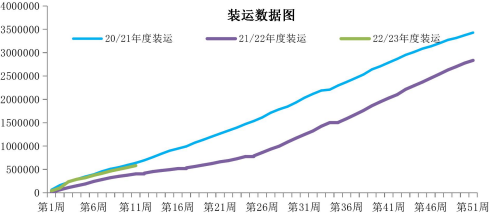 截至2022年10月27日,美國累計凈簽約出口2022/23年度棉花198.1萬噸,達到年度預期出口量的72.77%,累計裝運棉花60.9萬噸,裝運率30.76%。其中陸地棉簽約量為195.7萬噸,裝運60.5萬噸,裝運率30.89%。皮馬棉簽約量為2.4萬噸,裝運0.5萬噸,裝運率19.54%。