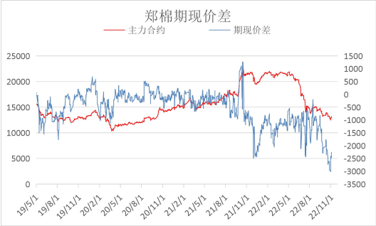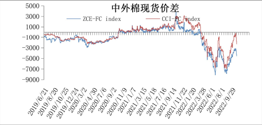 11月4日,鄭棉與CCI3128B指數價差為-2263元/噸,10月28日為-2960元/噸,期現價差有所縮小。