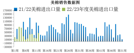 據美國農業部公布的美棉周度出口數據顯示,截至10月27日當周,美國2022/23年度陸地棉凈簽約43500噸(含簽約46335噸,取消前期簽約2835噸),較前一周增加180%;裝運陸地棉26989噸,較前一周增加33%。本周美棉簽約數據環比顯著增加,裝運數據表現尚可,整體來看本周美棉銷售數據表現亮眼。
