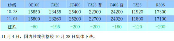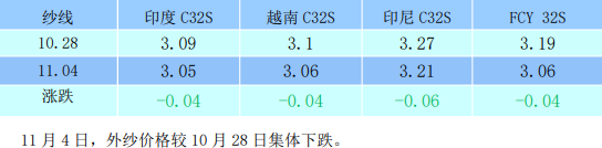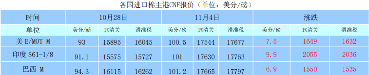 11月4日,國內棉花現貨價格指數CCI3128報15448元/噸;FCIndexM報100.72美分/磅,折1%關稅下價格17582元/噸,折滑準稅下17715元/噸。現貨價格指數和滑準稅下外棉價格比,價差-2267元/噸,10月28日為-297元/噸。和1%關稅下價格相比差-2134元/噸。現貨價格指數與滑準稅下價差大幅擴大。