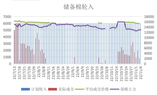 從本周國內棉花現貨報價來看,目前2022/23新疆機采3128B現貨主流報價14000—14200公定疆內庫,部分成交價低于報價,零星南疆盲盒價在13600—13650,同品質內地庫價格15000—15300公定。當前紡企對于棉花原料的采購,仍以隨用隨買的策略為主。從儲備棉成交情況來看,后半周儲備棉成交表現不佳。2022年7月13日至11月4日儲備棉累計掛牌47.3萬噸,成交8.592萬噸,成交率18.16%,成交加權均價15900元/噸。據全國棉花交易市場數據統計,截止到2022年11月4日,新疆地區皮棉累計加工總量105.72萬噸,同比減幅41.33%。