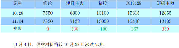 截至11月4日當周鄭棉主力01合約周五收盤報13185元/噸,較10月28日累計上漲330元/噸,漲幅為2.57%,持倉累計減少4.6萬手,至54萬手。