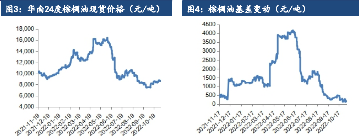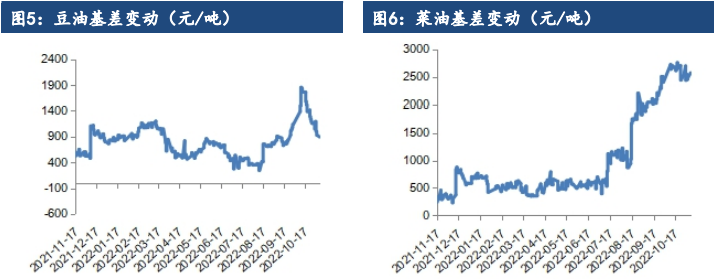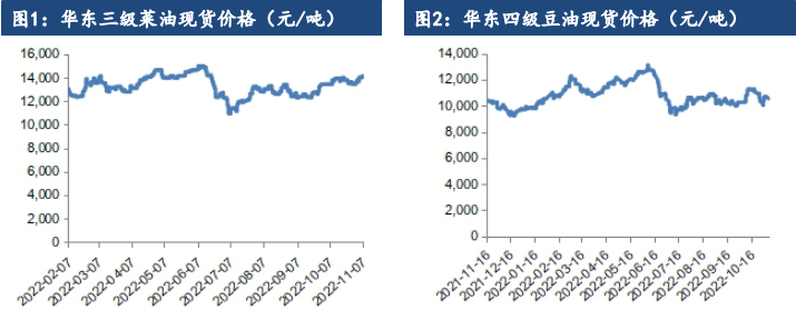 東莞遠大庫,24度,現貨,01+140。華南不定庫,24度,11月船,01+200。華南不定庫,24度,12月船,01+220。東莞庫18度,現貨,01+300。廣東三菜菜油1月,01+400元/噸。華東三級菜油報價:01+400元/噸(1-3月),05+950(2-5月),現貨01+2650。華東一豆基差報價:Y2301+1080元/噸(11月),Y2301+800元/噸(12-1月),Y2301+1100元/噸(2-3月),下跌20元/噸。油脂震蕩走低,菜油表現最強,破位下跌。臨近報告發布期,主要關注即將公布的MPOB和USDA報告,以及美國EPA未來三年的摻混要求。