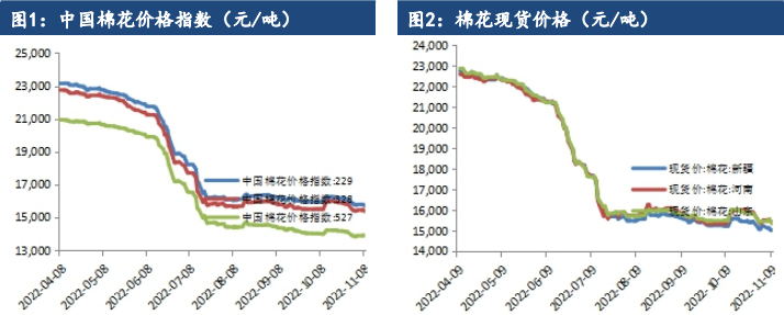 美國農業部11月報告顯示美棉庫存小幅增加,隔夜ICE棉價震蕩走弱,鄭棉主力合約維持震蕩運行。現貨方面最新價格指數328級在15364元/噸,跌97元/噸。2022/23年度新疆機采3128B現貨一口價報價在14000-14200公定疆內庫。