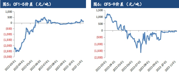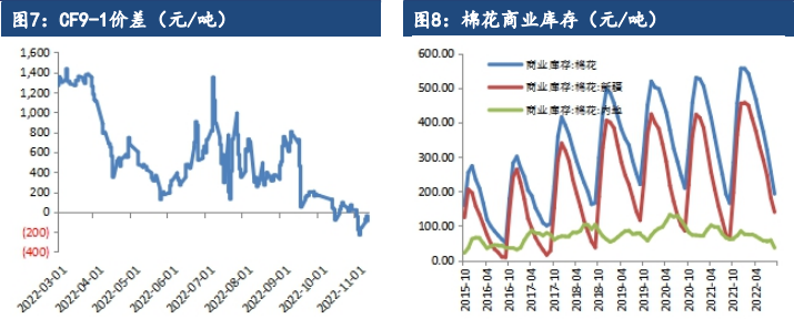 據農業農村部發布2022年11月中國農產品供需形勢分析,本年度棉花自播種以來,全國棉區綜合氣象條件總體適宜,棉花長勢好于預期,本月預測,2022/23年度產量調增17萬噸至603萬噸。受歐美等發達經濟體持續收緊貨幣政策、國內疫情等因素影響,紡織企業訂單不及預期,棉紡織品終端消費持續低迷,庫存高企,本月將新年度中國棉花消費調減15萬噸至770萬噸。考慮到國際棉價走勢持續強于國內,預計本年度進口仍將維持弱勢格局,本月將棉花進口量下調20萬噸至185萬噸,期末庫存增至728萬噸。