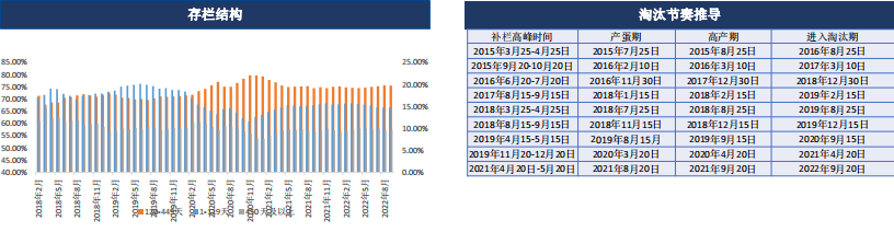 10月蛋價先小落后上漲,重心再次上移,養殖單位整理盈利水平尚可,淘雞積極性不高,加之淘汰雞價格漲至高位,適齡老雞出欄量不多,450日齡以上老雞占比10.14%,環比增加0.39個百分點。當前飼料成本維持相對高位,養殖單位淘雞后觀望心態濃厚,整體補欄積極性雖有提升但仍謹慎,120日齡以下后備雞占比14.82%,環比略增0.08個百分點。本月蛋市整體供應量仍處低位,主產蛋雞占比環比稍減,120-450日齡產蛋雞占比75.04%,環比減少0.47個百分點。后市看,當前待淘老雞存欄量仍有限,后期整體可淘量不多,預計后期占比或繼續維持相對低位;雞苗及青年雞補欄積極性略有好轉,但受高成本限制,預計后備雞占比或增幅有限。