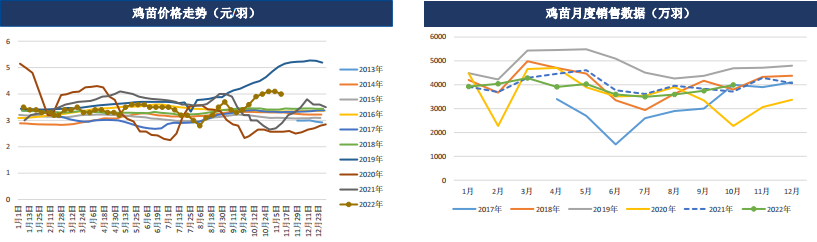 市場商品代雞苗價格局部上漲0.20-0.30元/羽,均價為3.44元/羽,環比漲幅1.47%,主流報價3.40-3.50元/羽,個別高價3.70-3.80元/羽,個別低價3.20元/羽。現階段蛋雞養殖利潤尚可,部分地區青年雞需求增加,拉動雞苗銷量,苗價穩步上漲。目前種雞企業訂單多數排至12月中旬,個別大廠排至下旬及2023年1月上旬,種蛋利用率多在60%-70%,個別達到80%。