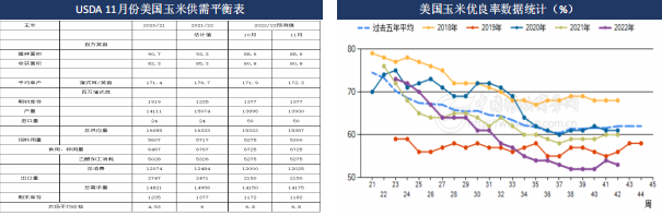 USDA11月供需報告顯示,美國2022/23年度玉米產量調高至139.30億蒲,比10月份預測的138.95億蒲調高0.35億蒲,玉米期末庫存調高到11.82億蒲,比上月預測11.72億蒲調高了0.1億蒲。