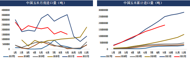 數據統計顯示,2022年1-9月玉米累計進口總量為1846萬噸,較上年同期的2493萬噸減少647萬噸,降幅25.95%。