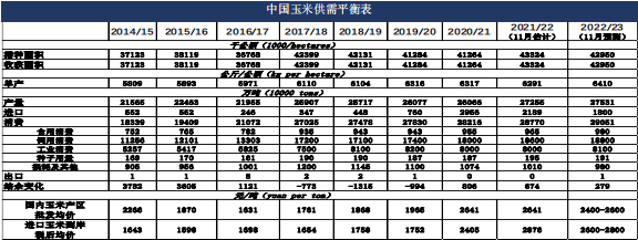 2021/22年度中國玉米進口量2189萬噸,出口量0.2萬噸,結余變化調整為674萬噸,其他估計數據不變。2022/23年度預測數據不做調整。