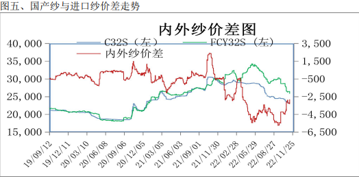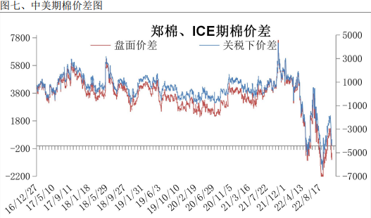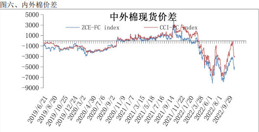 截至11月10日,ICE主力合約12月收盤價86.55分/磅,折合盤面價13818元/噸,與鄭棉2301合約價差-518元/噸;以10美分的貿易升貼水算,折合人民幣價格17170元/噸,與鄭棉2301合約盤面價差(鄭棉-ICE棉)-3870元/噸。